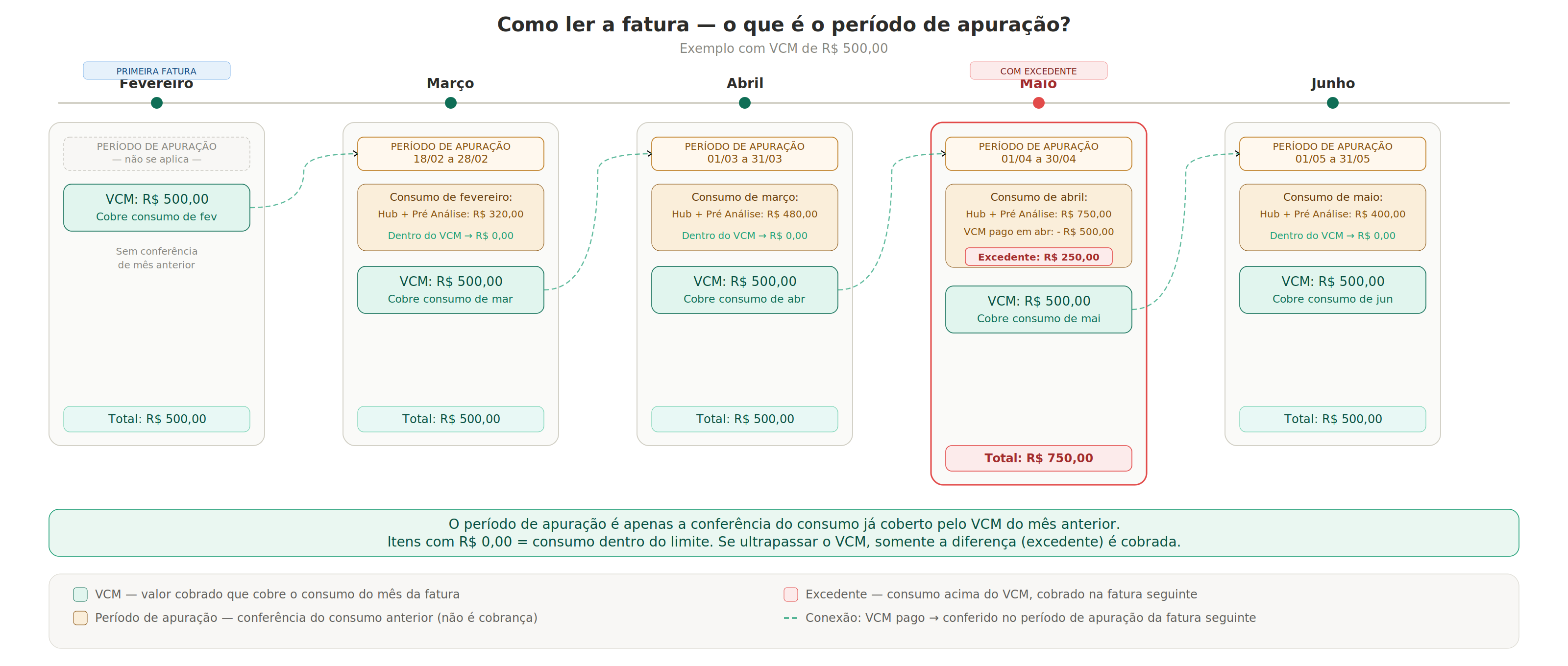 O período de apuração é o mês anterior ao da fatura. Nele, o sistema contabiliza todas as consultas realizadas e compara com o VCM que foi pago naquele mês. Se o consumo ficou dentro do limite, os itens aparecem zerados. Se ultrapassou, a diferença é lançada como excedente.
